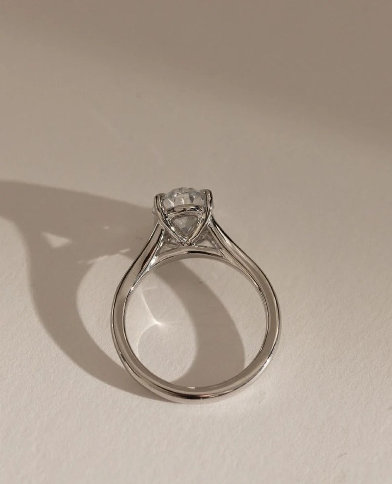 Hidden halo detailing enhances sparkle while keeping a clean solitaire look.
