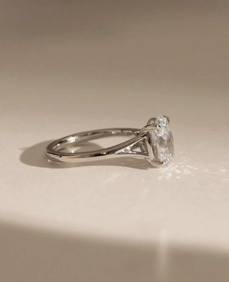 The oval cut symbolizes endless love and individuality, known for its elongated shape that flatters the hand and maximizes sparkle. The hidden halo creates a subtle glow beneath the center stone, while the split shank band adds sophistication and balance.