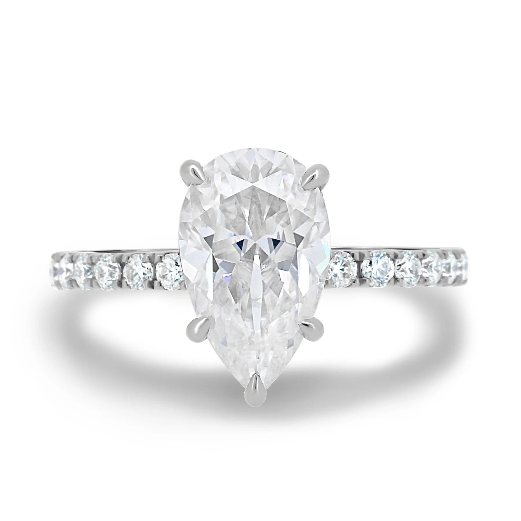 This Pear Cut Hidden Halo Engagement Ring features a breathtaking 2.0CT–4.0CT Moissanite center stone, cut in a graceful teardrop shape that symbolizes tears of joy and everlasting love. The hidden halo adds a secret touch of sparkle beneath the center stone, making this ring shine from every angle.