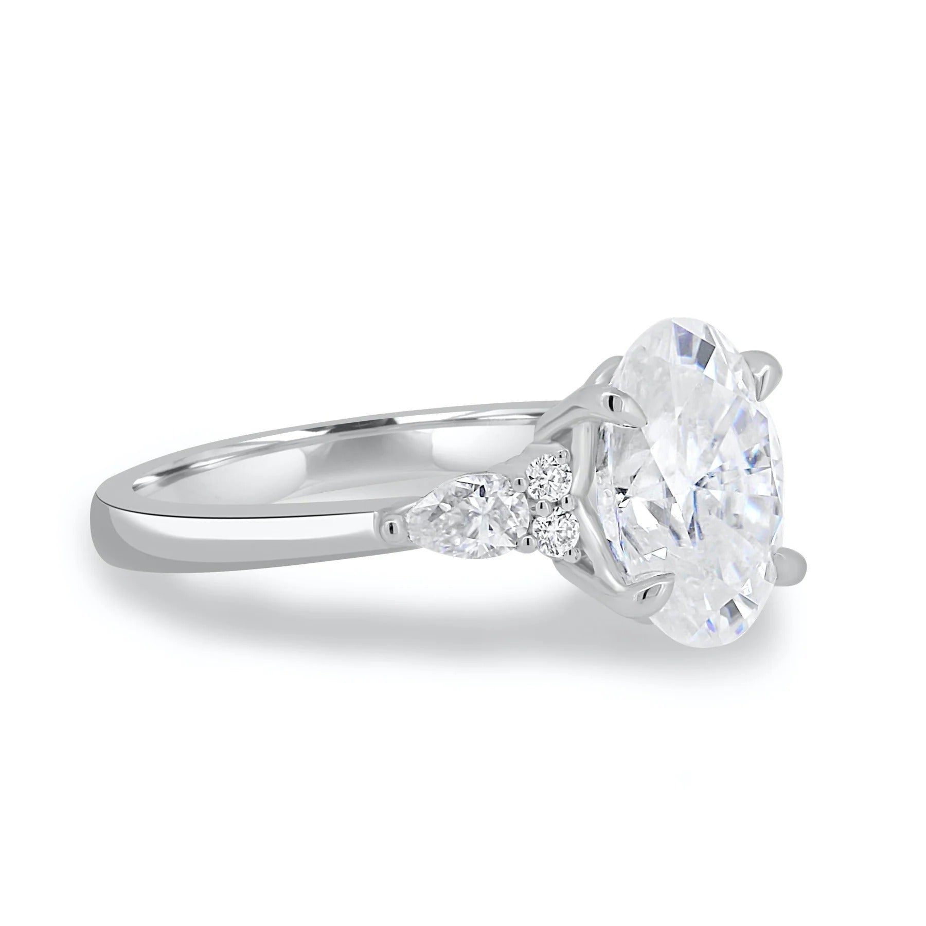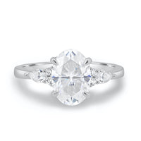 Our 2.0CT Oval Cut Engagement Ring is a dazzling expression of love and sophistication. Featuring a brilliant oval cut center stone available in Moissanite or Lab Grown Diamond, this ring is enhanced with pear-shaped and round cut side stones for extra sparkle and brilliance.