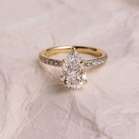 Gracefully elegant and effortlessly radiant, this pear cut engagement ring is the embodiment of timeless romance. The teardrop-shaped center stone is set in a classic 5-prong solitaire setting, enhanced by a slim band lined with pavé-set diamonds for added sparkle and sophistication.