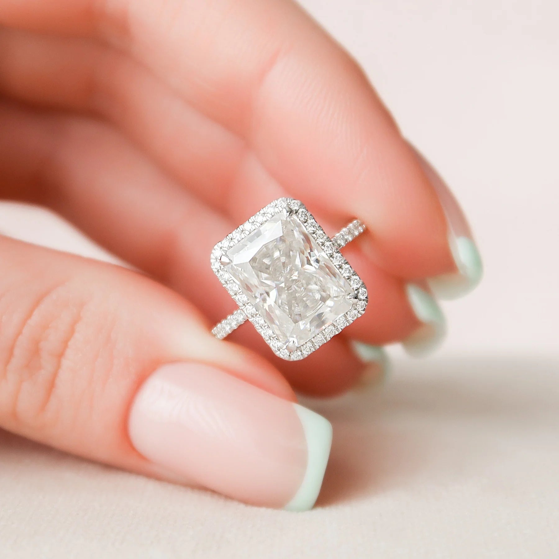 The centerpiece 5.0CT radiant cut Moissanite captivates with its elongated facets and unmatched brilliance, encircled by a sparkling halo that enhances its size and fire. This striking design symbolizes eternal love and radiant beginnings.