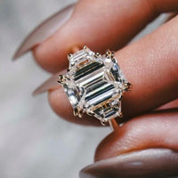 Mark your journey of love with this stunning 4 Carat Emerald Cut Moissanite Three Stone Ring, symbolizing the Past, Present, and Future of your relationship. Featuring a radiant emerald-cut center stone flanked by two perfectly matched side stones, this ring is a timeless expression of elegance and meaning.