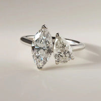 Celebrate the beauty of duality with our Toi et Moi Moissanite Engagement Ring, symbolizing two souls intertwined. This unique bypass-style ring features one brilliant marquise cut and one sparkling pear cut moissanite, each expertly set in a minimalist 14K solid gold band. The asymmetrical design makes it perfect for modern brides who embrace individuality, love symbolism, and timeless elegance.